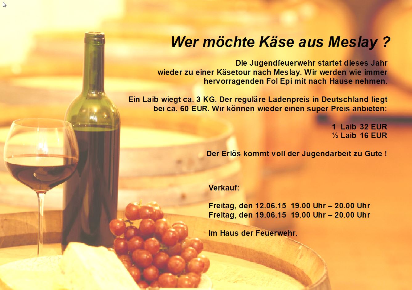 Traditionsgemäß wird auch in diesem Jahr wieder eine Delegation der Jugendfeuerwehr in die französische Partnerstadt Meslay-du-Maine fahren und auf dem Rückweg leckeren Fol-Epi Käse mitbringen.