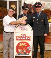 Mit einer Spende in Höhe von 300,-- EUR unterstützt die Bäckerei Boger die Jugendarbeit der Feuerwehr Remseck im Rahmen der Aktion „Floriansbrot“, einer gemeinsamen Initiative des Deutschen Bäckereihandwerks und dem Deutschen Feuerwehrverband. Bäckermeister Björn Boger berichtet stolz von 300 verkauften Floriansbroten, von denen ein Teil des Verkaufserlöses der Jugendfeuerwehr zu Gute kommt. Jugendfeuerwehrwart Oliver Semmler freut sich gemeinsam mit Kommandant Helmut Wibel über diese Spende: „Das Geld verwenden wir für unser diesjähriges Zeltlager in Frankreich. Dadurch können wir die Teilnehmerbeiträge insbesondere für Familien mit mehreren Kindern niedrig halten.“