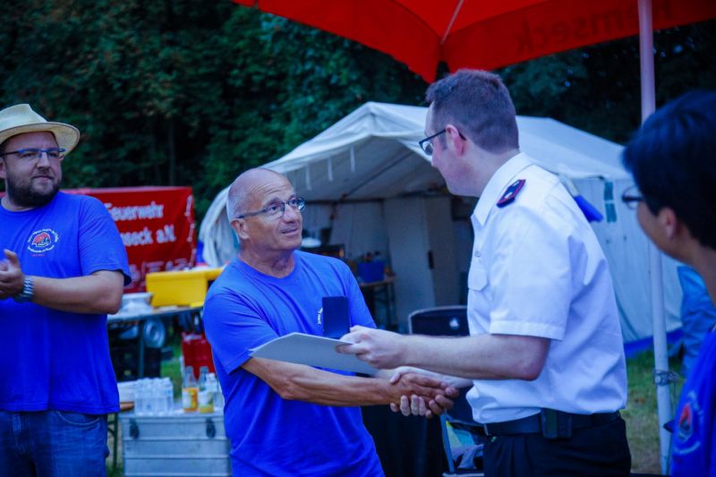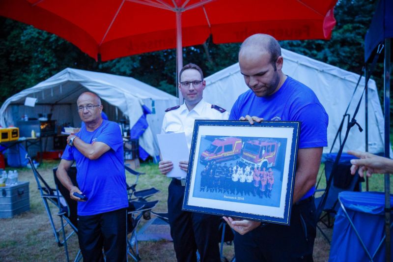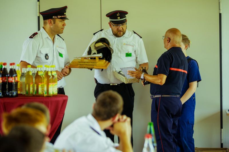 Am gemeinsamen Abschlussabend konnte der anwesende Kreisjugendfeuerwehrwart Oliver Semmler den ehemaligen Jugendwart aus den drei Täler, Herrn Guy Ferber mit der Floriansplakette der Jugendfeuerwehr Baden-Württemberg für herausragend internationale Jugendarbeit ehren.