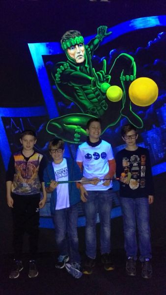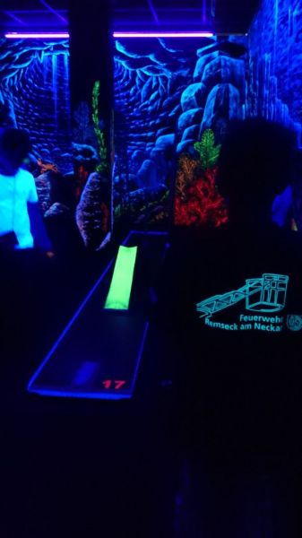 Nach ca. 20 min. Fahrtzeit kamen wir an. Wir mussten unsere Punkte nicht auf ein Blatt Papier schreiben sondern auf einem Smartphone eingeben. Die Bahnen wurden von Schwartzlichtlampen beleuchtet, die 3D Effekte waren ganz lustig. Es gab fast 20 Bahnen. Nach dem Minigolf hatten wir (Gruppe 3) noch eine Übung für alle Anderen war es dann zu Ende. (von Quentin)
